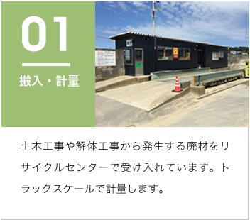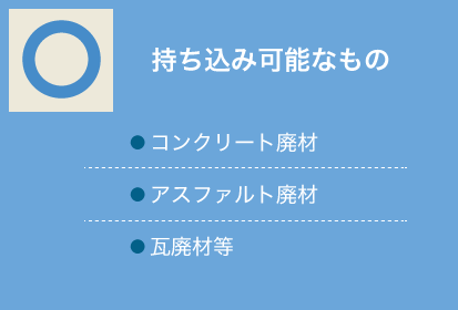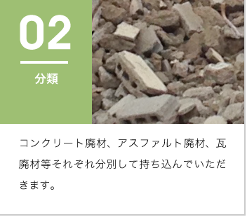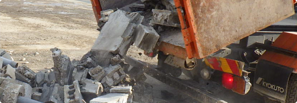 循環型社会構築のために、産業廃棄物リサイクルプラントを運営し、資源の有効活用に貢献しています。 主に土木工事や解体工事から発生するコンクリート廃材、アスファルト廃材、瓦廃材等をリサイクルし、再生骨材として道路工事や基礎工事に再利用しています。