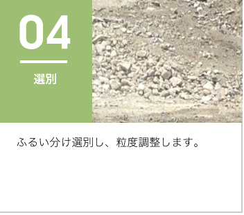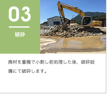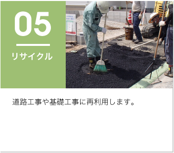 eデザインでは、各種建設現場から発生するコンクリート廃材、アスファルト廃材、瓦廃材等をリサイクルセンターで回収し、リサイクル砕石を生産しています。出来た砕石は道路工事や基礎工事にリサイクルしています。